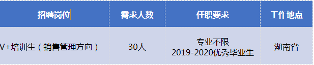 2. “V+计划”将基于【销售管理】方向,引进一批有激情、热爱电子通讯行业、具备管理潜质的实干型人才,经过入职培训、轮岗培养、定岗培养后成为公司的【管理储备人员】,帮助管理培训生找到自己的职业发展方向并实现飞跃发展,实现自己的人生梦想!