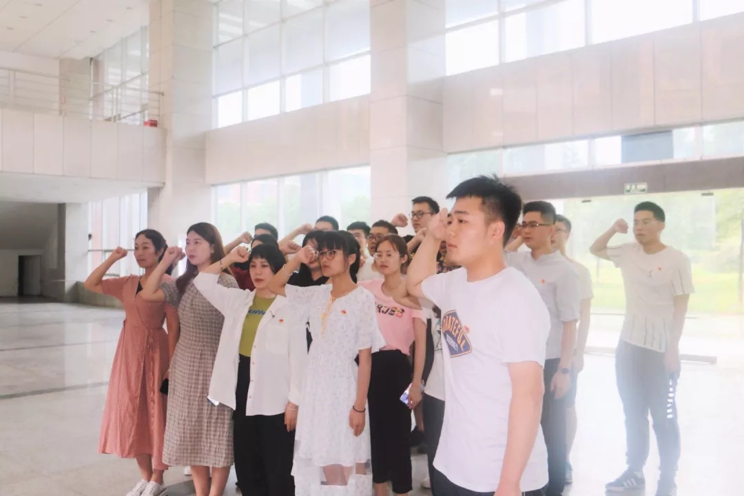 15:00,周梦婷宣布会议正式开始,全体起立,齐唱国歌。在毛泽东同志铜像前,员工党员梁鑫森带领全体党员面向党旗,庄严宣誓,对党忠诚,为共产主义奋斗终身。会上,同志们共同观看红色影片《初心,从未改变》,感受革命先辈的初心,回忆自己出发时的使命。毕业生党员代表李文杰结合自身经历,强调了初心对一名共产党员的重要性,并祝福同志们不忘初心,砥砺前行。肄业班的党员同志拍摄了视频《共筑城院梦》并在会上播放,表达了对毕业生党员的真切祝福。
