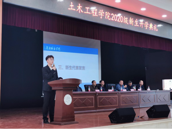 老生代表1903702班--贺沐祖同学、新生代表2003901班--王国栋同学、教师代表--水利水电工程系副主任仇振杰博士先后发言。他们分别表达了对新同学的热烈欢迎与衷心祝贺,对大学学习生活的规划与憧憬,对未来人生的美好期盼与祝福。