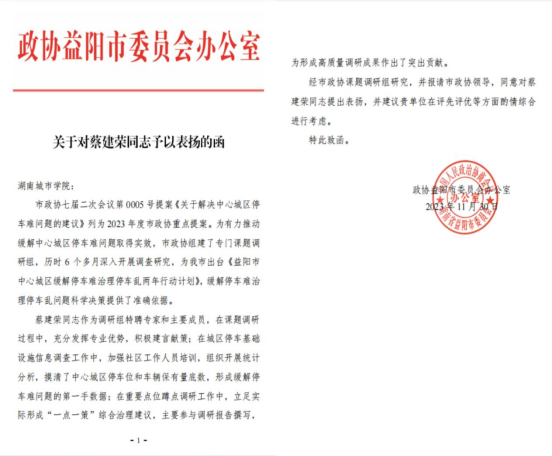 近日,从政协益阳市委员会传来消息,公司交通工程系主任蔡建荣同志作为2023年度市政协重点提案《关于解决中心城区停车难问题的建议》专题调研组特聘专家,在课题调研过程中,充分发挥专业优势,积极建言献策;在城区停车基础设施信息调查工作中,加强社区工作人员培训,组织开展统计分析,摸清了中心城区停车位和车辆保有量底数,形成缓解停车难问题的第一手数据;在重要点位蹲点调研工作中,立足实际形成“一点一策”综合治理建议,主要参与调研报告撰写,为形成高质量调研成果作出了突出贡献。得到了政协益阳市委员会的书面表扬。