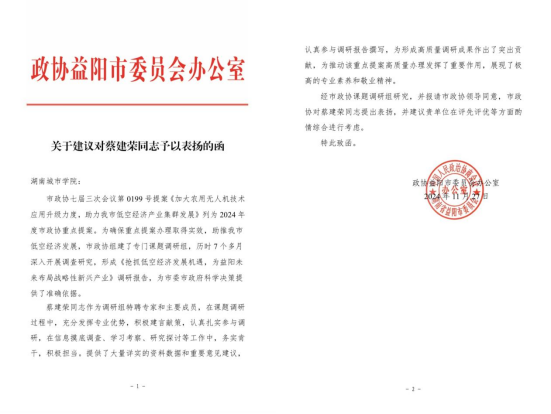 近日,从政协益阳市委员会传来消息,公司交通工程系主任蔡建荣同志作为2024年度市政协重点提案《加大农用无人机技术应用升级力度,助力我市低空经济产业集群发展》专题调研组特聘专家和主要成员,在课题调研过程中,充分发挥专业优势,积极建言献策,认真扎实参与调研,在信息摸底调查、学习考察、研究探讨等工作中,务实肯干,积极担当。提供了大量详实的资料数据和重要意见建议,认真参与调研报告撰写,为形成高质量调研成果作出了突出贡献,为推动该重点提案高质量办理发挥了重要作用,展现了极高的专业素养和敬业精神。得到了政协益阳市委员会的书面表扬。