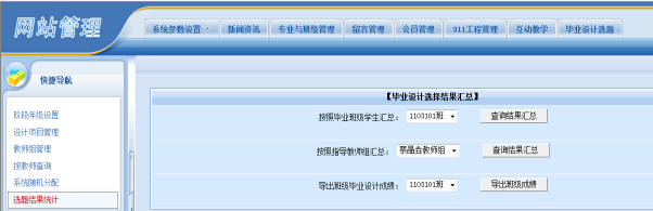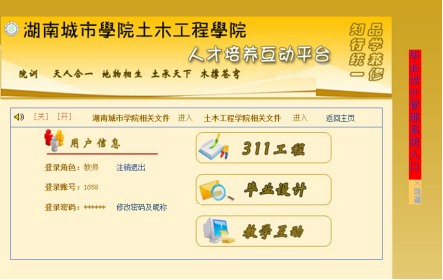 土木院土木工程专业毕业设计工作的员工选题、指导老师和员工的双向选择、阶段成绩的提交及毕业设计相关数据统计均实行网络管理。工作网络涉及公司教务处网络平台和土木院网络平台。毕业设计工作网络运行时间从毕业设计动员开始至毕业设计工作结束为止。
