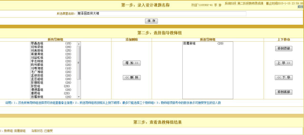 员工和指导老师关系的建立由网上双向选择确定。故设计小组与设计大组的员工并非隶属于同一个班级。毕业答辩以班级为单位进行,答辩老师小组由毕业设计答辩委员会安排确定,在一定程度上实现了交叉答辩。毕业设计成果由指导老师收集统一上交存档。指导老师对设计成果的质量和完整性负责。