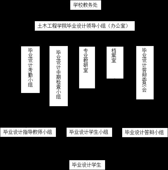 第二级为土木院毕业设计领导小组,按照教务处要求,经公司党政联系会议通过成立,设办公室(教务办兼)。主要负责核定毕业设计指导模式、设计内容、选题、教团队格、毕业设计成绩,制定毕业设计计划等,办公室全面负责毕业设计事务日常管理。