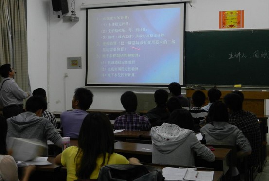 讲座开始,周斌博士用简单语言跟同学们介绍了《深基坑与边坡工程设计理念》所包括的主要内容:造成基坑与边坡工程失事的实例、深基坑支护事故分析及处理对策、深基坑支护设计与计算、边坡挡墙支护设计与计算等等。其重点跟我们分析了现今深基坑结构承载的计算和边坡修理维护等工作。告诉我们现今深基坑支护结构的设计理论虽然有了很大发展,但是在实际施工中仍然存在许多不足的地方, 需要克服众多困难,如:边坡承载能力计算、基坑的变形计算、地下水控制估算和验算。有困难就要解决困难,因此周斌博士还跟我们讲到了基坑和边坡的永久性维护结构,其结构既可以满足施工围护结构的要求,还可以满足结构传力、协调变形、防渗等要求,从而使得很多问题就迎刃而解了。